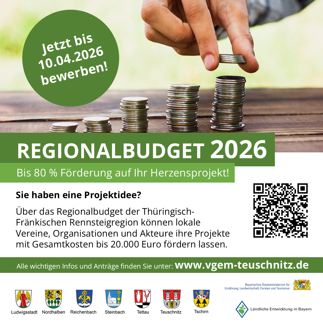 Bis zum 10. April 2026 können Förderanträge für Kleinprojekte im Rahmen des Regionalbudgets bei der ILE Thüringisch-Fränkische Rennsteigregion eingereicht werden. Weitere Infos rund um das Regionalbudget und die Antragsunterlagen finden Sie unter www.vgem-teuschnitz.de.